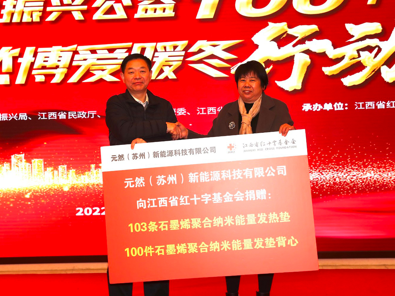 1月14日,由江西省省紅十字會(huì)、省民政廳、省衛(wèi)生健康委、省鄉(xiāng)村振興局、省工商聯(lián)共同主辦,省紅十字基金會(huì)承辦的“江西鄉(xiāng)村振興公益100+ 元然博愛(ài)暖冬行動(dòng)”在南昌啟動(dòng)。此次博愛(ài)暖冬行動(dòng),元然(蘇州)新能源科技有限公司捐贈(zèng)的物品是石墨烯聚合納米發(fā)熱服及發(fā)熱墊,該系列產(chǎn)品的專(zhuān)項(xiàng)技術(shù)也應(yīng)用在2022年北京冬奧會(huì)發(fā)熱服裝配套項(xiàng)目...